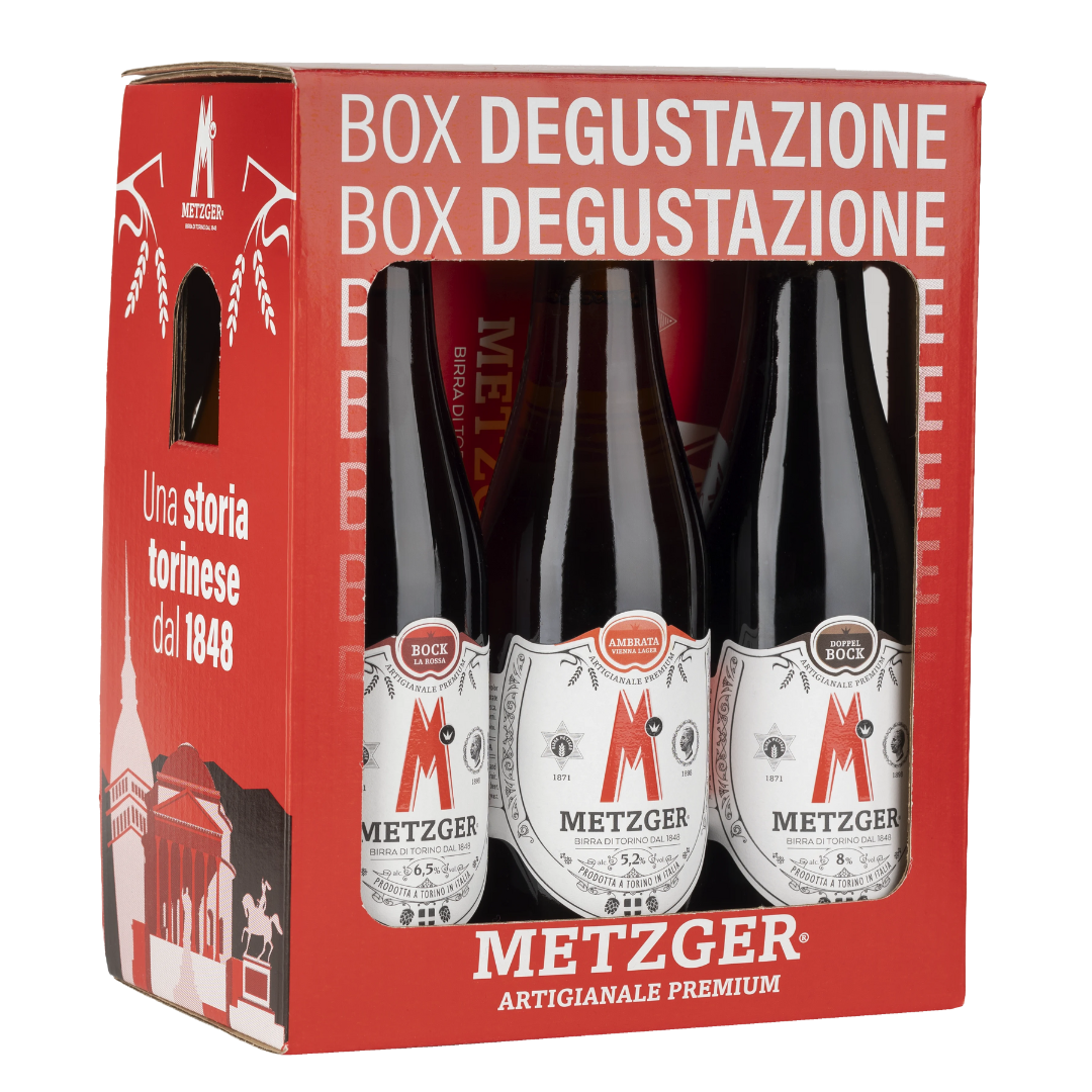 Il box da 6 Metzger® riunisce in un’unica confezione sei interpretazioni complementari della tradizione birraria mitteleuropea e contemporanea: 1 Bock, 1 Doppelbock, 1 Ambrata Vienna Lager, 1 Weiss Classica, 1 Modern IPA e 1 Bionda Lager Helles, tutte in formato 33 cl. La selezione spazia dalle note morbide e dorate della Helles al carattere fruttato e luppolato della IPA, passando per la cremosità speziata della Weiss e per le sfumature più corpose e maltate di Bock, Doppelbock e Ambrata.